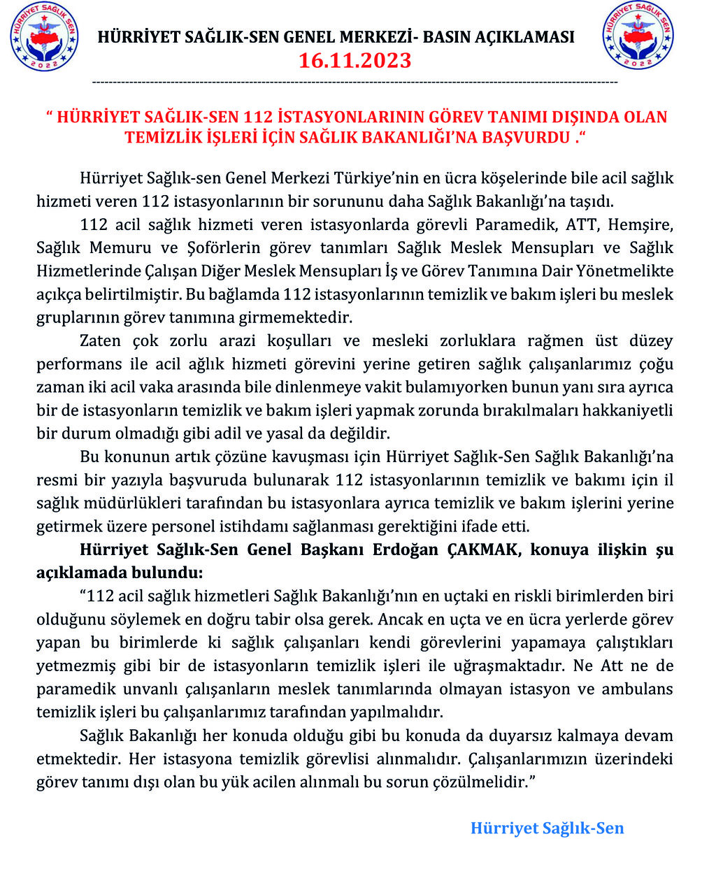 Paramedik, ATT, Hemşire, Sağlık Memuru ve Şoförlerin görev tanımları, Sağlık Meslek Mensupları ve Sağlık Hizmetlerinde Çalışan Diğer Meslek Mensupları İş ve Görev Tanımına Dair Yönetmelikte açıkça belirtilmiştir. Ancak, 112 istasyonlarının temizlik ve bakım işleri, bu meslek gruplarının görev tanımına girmemektedir.Zorlu arazi koşulları ve mesleki zorluklara rağmen üst düzey performans sergileyen sağlık çalışanları, acil sağlık hizmeti görevini yerine getirirken sık sık dinlenme fırsatı bulamamakta ve bir yandan da istasyonların temizlik ve bakım işleriyle uğraşmaktadırlar. Bu durum, hakkaniyetli ve adil olmayan bir çalışma şartını ortaya koymaktadır.Hürriyet Sağlık-Sen Genel Başkanı Erdoğan Çakmak, sorunun çözümü için Sağlık Bakanlığı'na resmi bir başvuru yaparak, 112 istasyonlarının temizlik ve bakım işleri için il sağlık müdürlükleri tarafından ayrıca personel istihdamı sağlanması gerektiğini vurguladı.