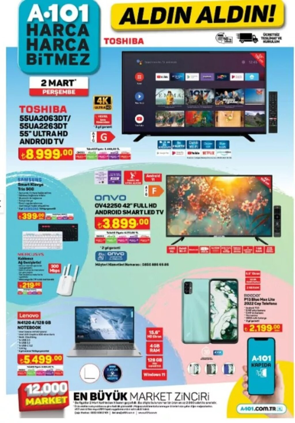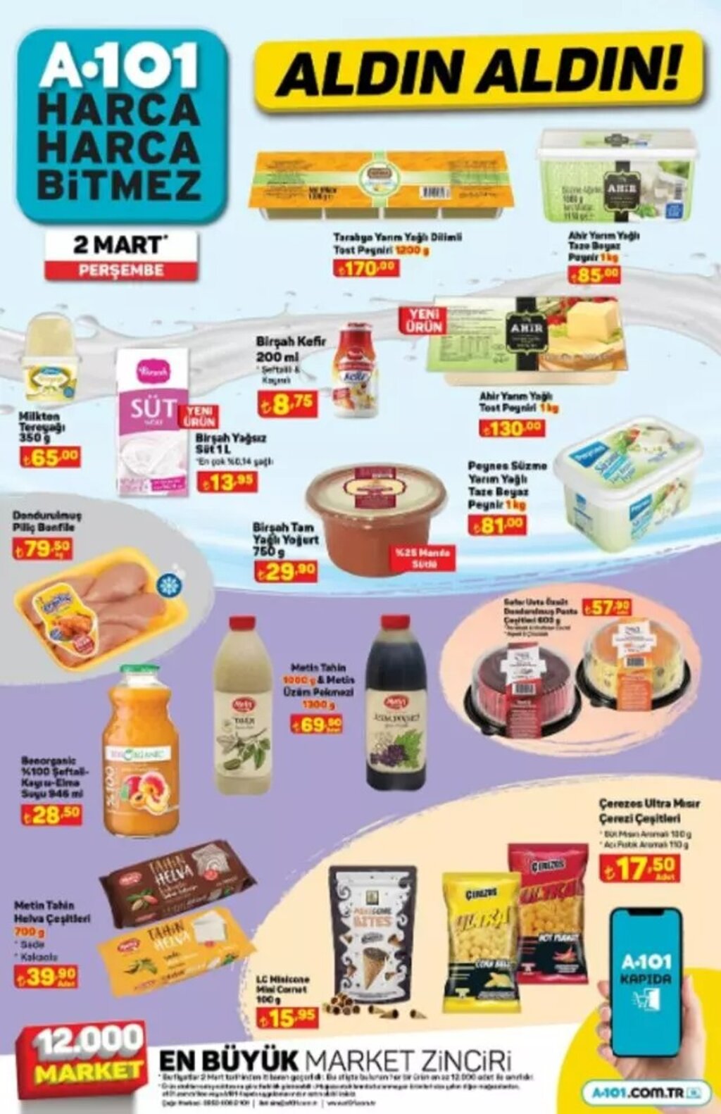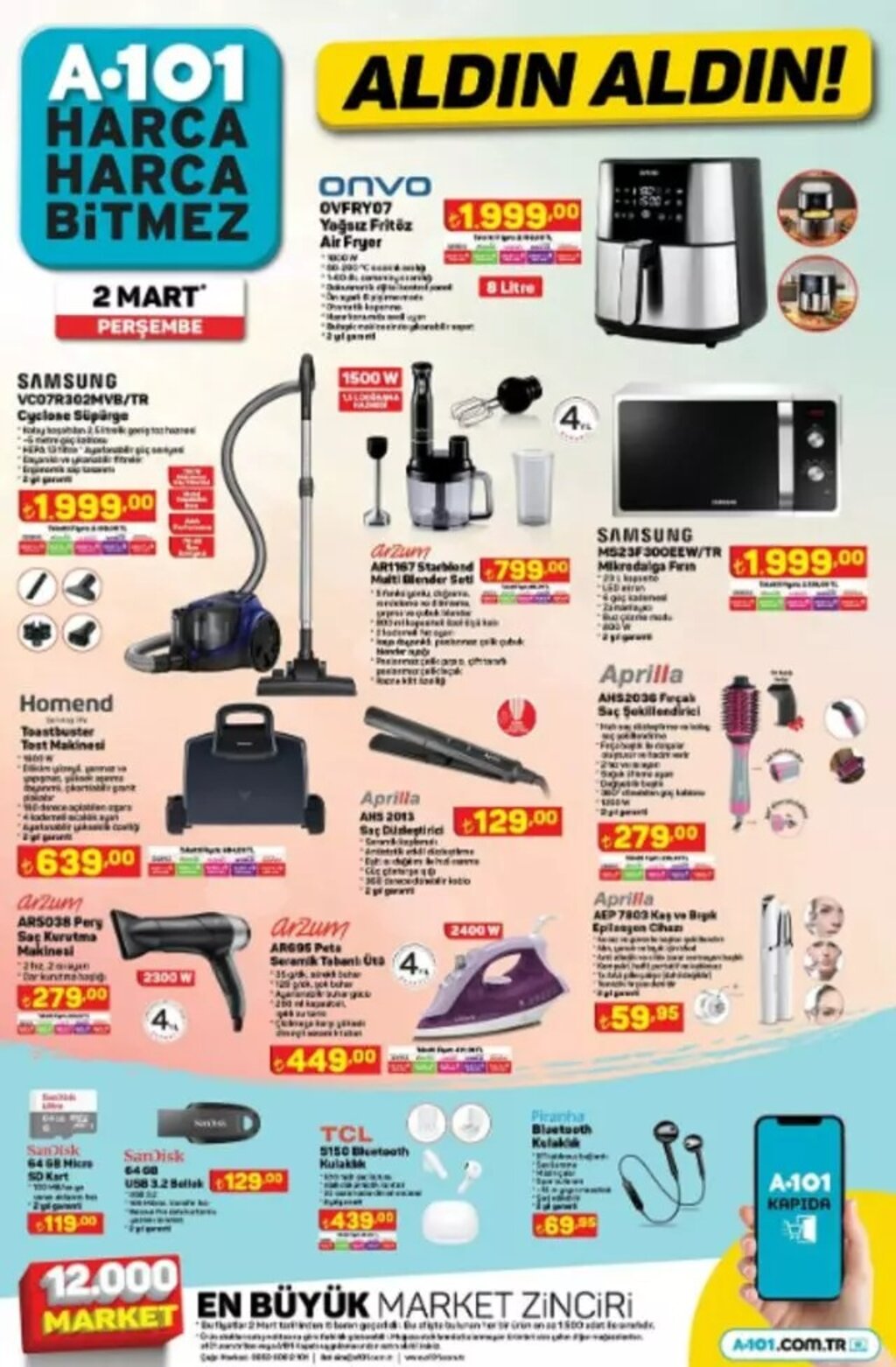 Türkiye genelinde binlerce şubesi bulunan A101, 2 Mart itibarıyla geçerli olacak indirimli ürünler kataloğunu yayımladı. Toplam 8 sayfadan oluşan kampanya listesinde beyaz eşyadan elektroniğe, gıdadan temizlik ve tekstil ürünlerine kadar birçok ürün uygun fiyatlarla satışa sunulacak.