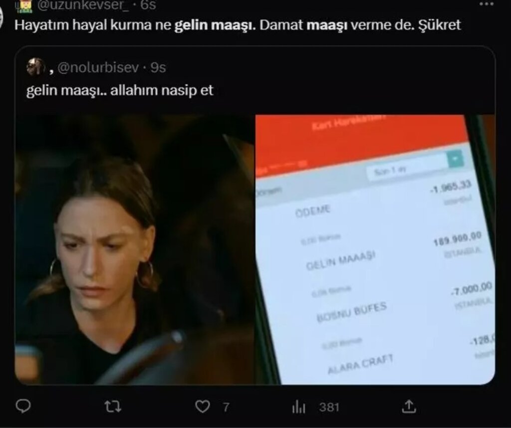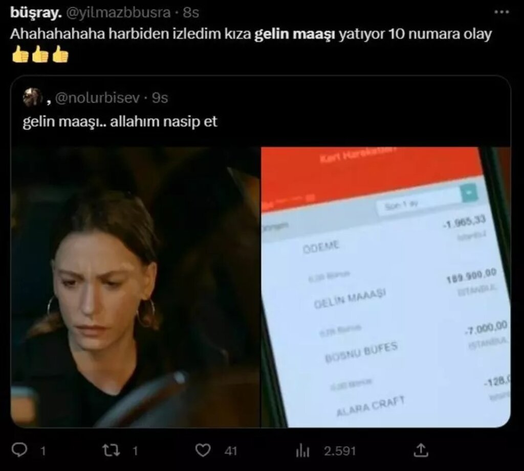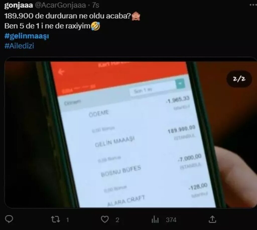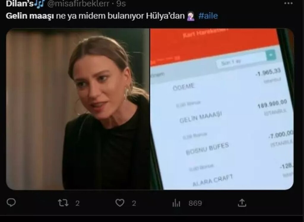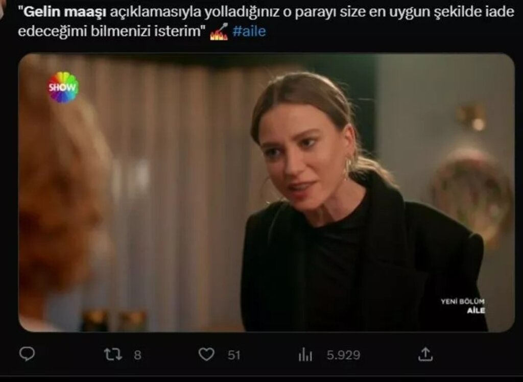 Dizinin özgün senaryosunu Hakan Bonomo'nun yazdığı ve Ahmet Katıksız'ın yönetmenliğini üstlendiği Aile dizisinde, Nejat İşler, Canan Ergüder, Ushan Çakır, Umutcan Ütebay, Yüsra Geyik, Mert Denizmen, Ecem Simge Yurdatapan gibi başarılı oyuncular da yer alıyor. Aynı zamanda usta oyuncular Levent Ülgen, Emel Göksu ve Nur Sürer de dizide önemli rollerde bulunuyor.Dizinin son bölümlerinde Devin karakterine gönderilen 'gelin maaşı' sahnesi, sosyal medyada geniş yankı uyandırdı. Kimileri "189.900 de durduran ne oldu acaba?" gibi yorumlar yaparken, bazıları da "Rabbim bana da nasip et" gibi espri dolu yorumlarda bulundu.İşte Aile dizisindeki o sahneye gelen yorumlardan bazıları: