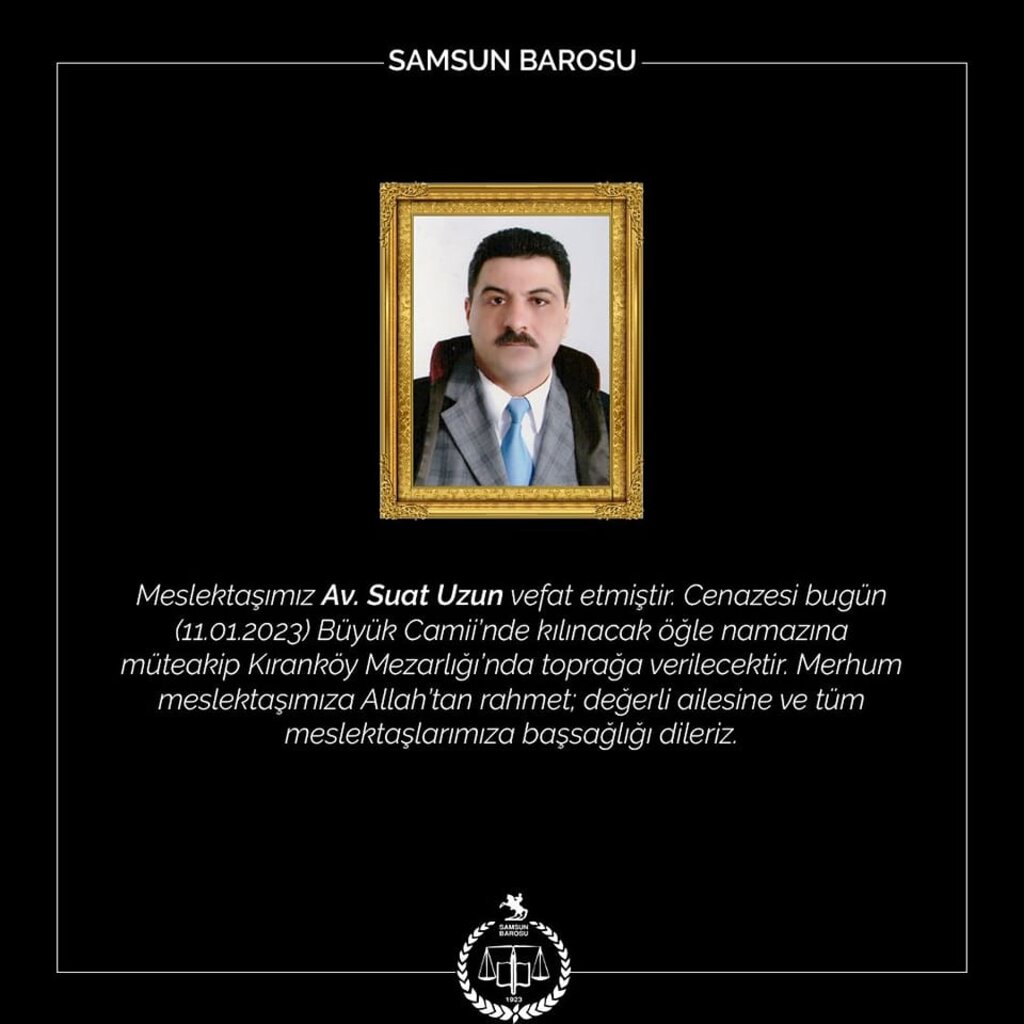 Samsun Barosu, Suat Uzun’un vefatı dolayısıyla kurumsal sosyal medya hesapları ve internet sitesi üzerinden bir açıklama yayımladı. Açıklamada şu ifadelere yer verildi:
