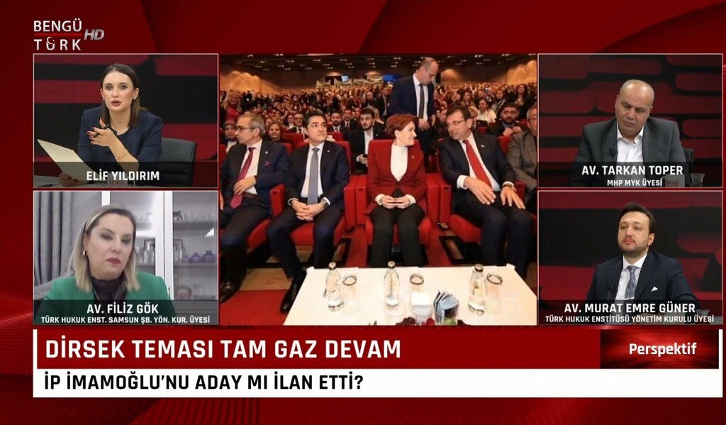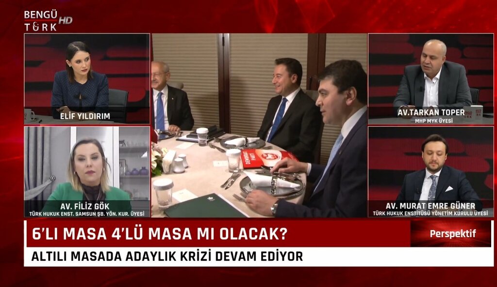 Türk Hukuk Enstitüsü Samsun Şubesi Yönetim Kurulu Üyesi Av. Filiz Gök, Bengü Türk ekranlarında Elif Yıldırım’ın sunduğu Perspektif programının konuğu oldu. Programda iç siyaset ve dış politikaya dair güncel gelişmeler ele alınırken, özellikle 6’lı masa ve Cumhurbaşkanlığı adaylığı tartışmaları gündemin merkezinde yer aldı.