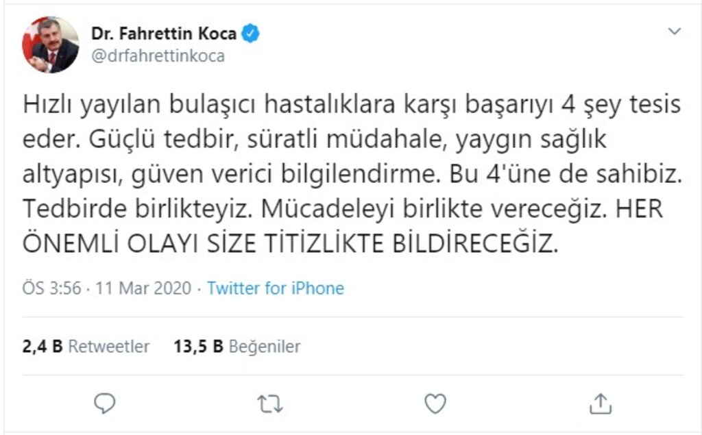 “Hızlı yayılan bulaşıcı hastalıklara karşı başarıyı dört şey tesis eder: Güçlü tedbir, süratli müdahale, yaygın sağlık altyapısı ve güven verici bilgilendirme. Bu dördüne de sahibiz. Tedbirde birlikteyiz. Mücadeleyi birlikte vereceğiz. Her önemli olayı size titizlikle bildireceğiz.”
