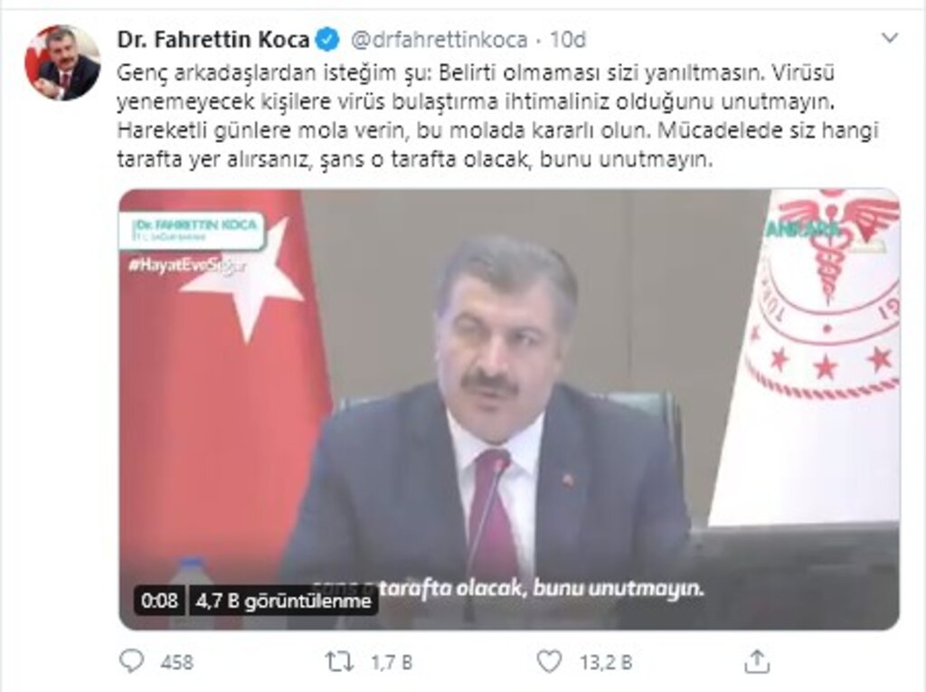 Bakan Koca, paylaşımında gençlere şu sözlerle seslendi: “Genç arkadaşlardan isteğim şu: Belirti olmaması sizi yanıltmasın. Virüsü yenemeyecek kişilere virüs bulaştırma ihtimaliniz olduğunu unutmayın. Hareketli günlere mola verin, bu molada kararlı olun. Mücadelede siz hangi tarafta yer alırsanız, şans o tarafta olacak, bunu unutmayın.”