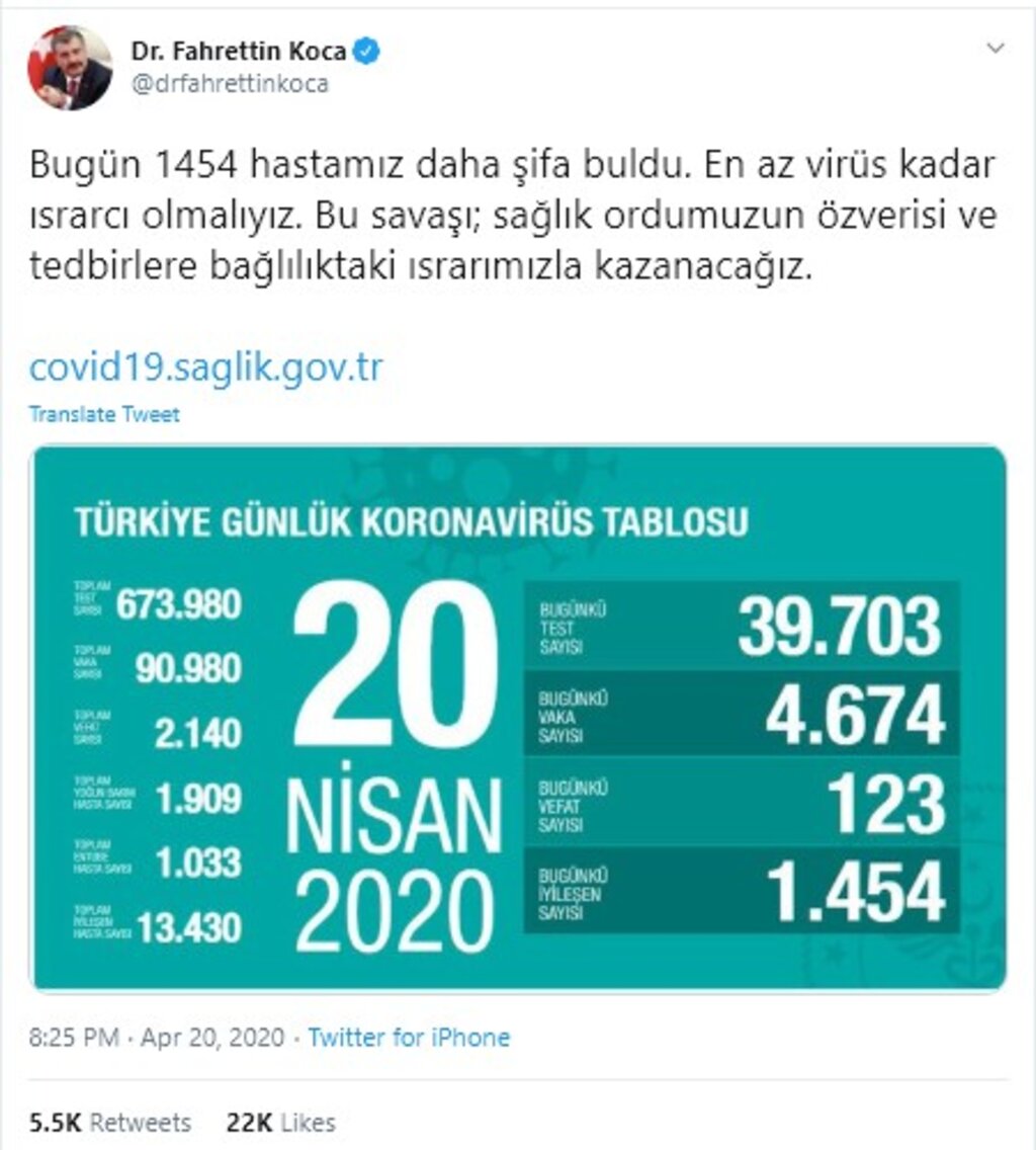 “Bugün 1454 hastamız daha şifa buldu. En az virüs kadar ısrarcı olmalıyız. Bu savaşı; sağlık ordumuzun özverisi ve tedbirlere bağlılıktaki ısrarımızla kazanacağız.”