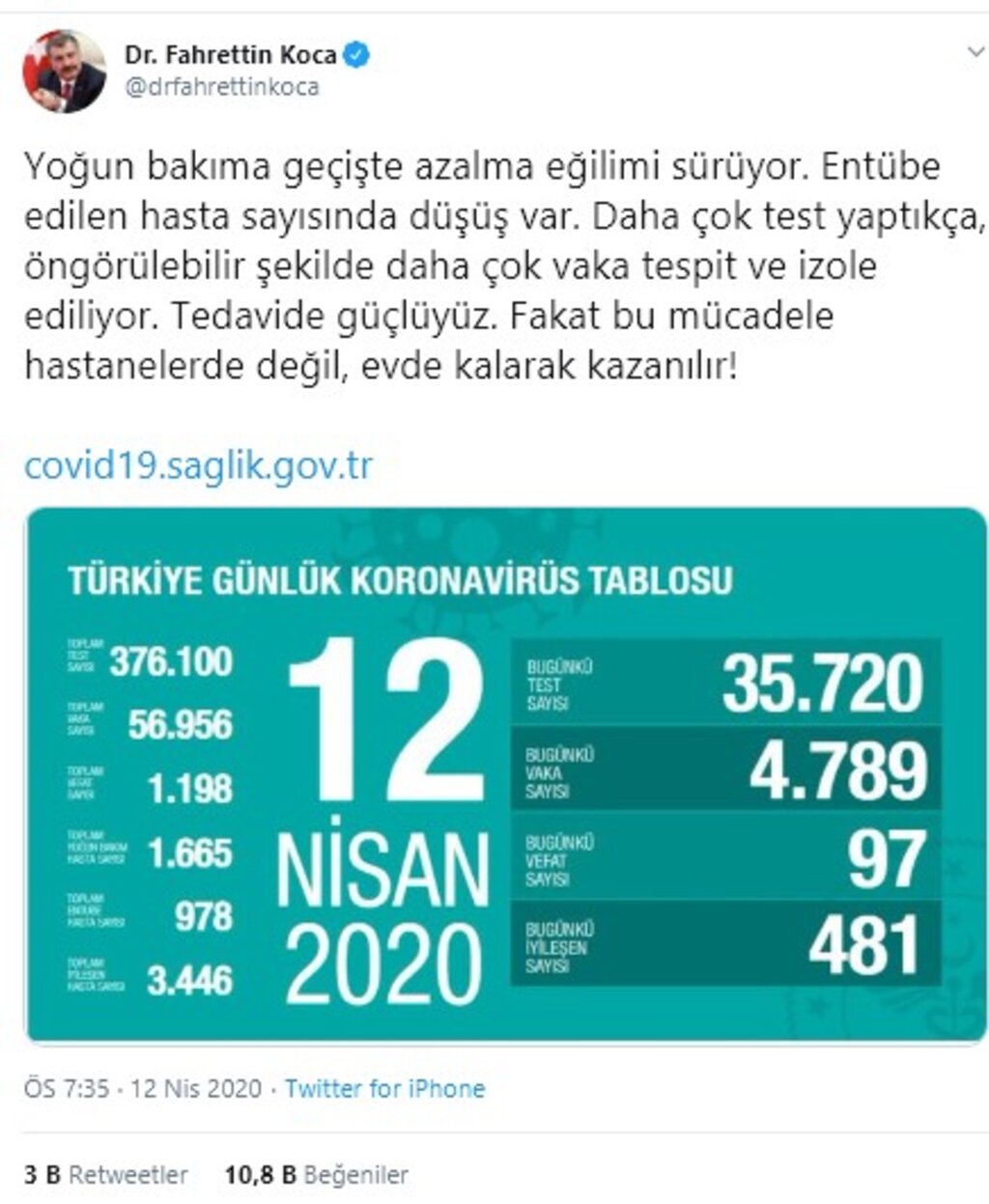 “Yoğun bakıma geçişte azalma eğilimi sürüyor. Entübe edilen hasta sayısında düşüş var. Daha çok test yaptıkça, öngörülebilir şekilde daha çok vaka tespit ve izole ediliyor. Tedavide güçlüyüz. Fakat bu mücadele hastanelerde değil, evde kalarak kazanılır!”