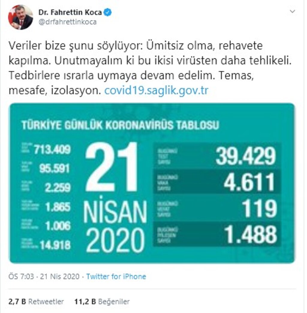 "Veriler bize şunu söylüyor: Ümitsiz olma, rehavete kapılma. Unutmayalım ki bu ikisi virüsten daha tehlikeli. Tedbirlere ısrarla uymaya devam edelim. Temas, mesafe, izolasyon."