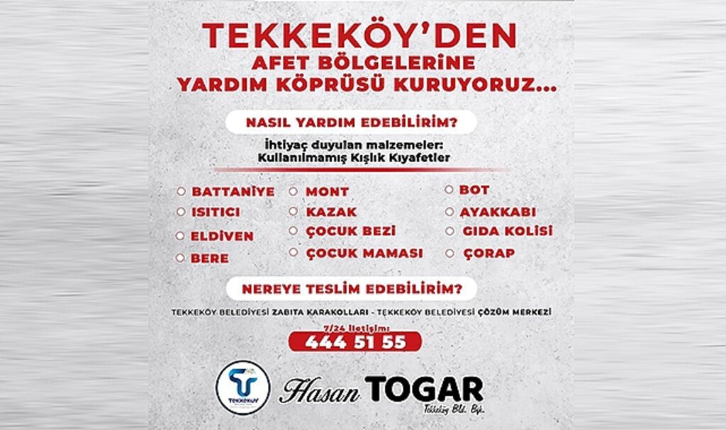 Tekkeköy Belediyesi, afet yaşanan bölgelere yardım ulaştırmak amacıyla kapsamlı bir yardım kampanyası başlattı. Belediye Başkanı Hasan Togar’ın talimatıyla hayata geçirilen kampanya kapsamında, afetzedelerin temel ihtiyaçlarını karşılamaya yönelik malzemeler toplanarak bölgeye gönderilecek.