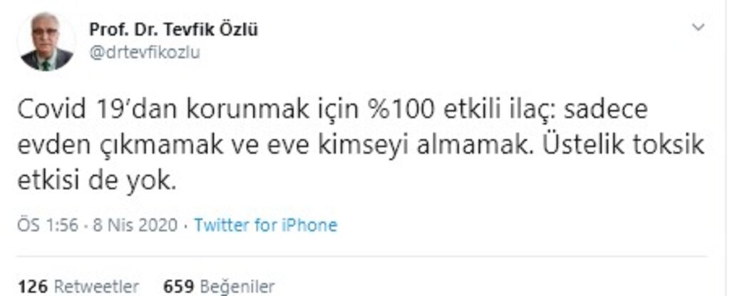 Prof. Dr. Özlü, paylaşımında şu ifadeleri kullandı: “Covid 19’dan korunmak için %100 etkili ilaç: sadece evden çıkmamak ve eve kimseyi almamak. Üstelik toksik etkisi de yok.”