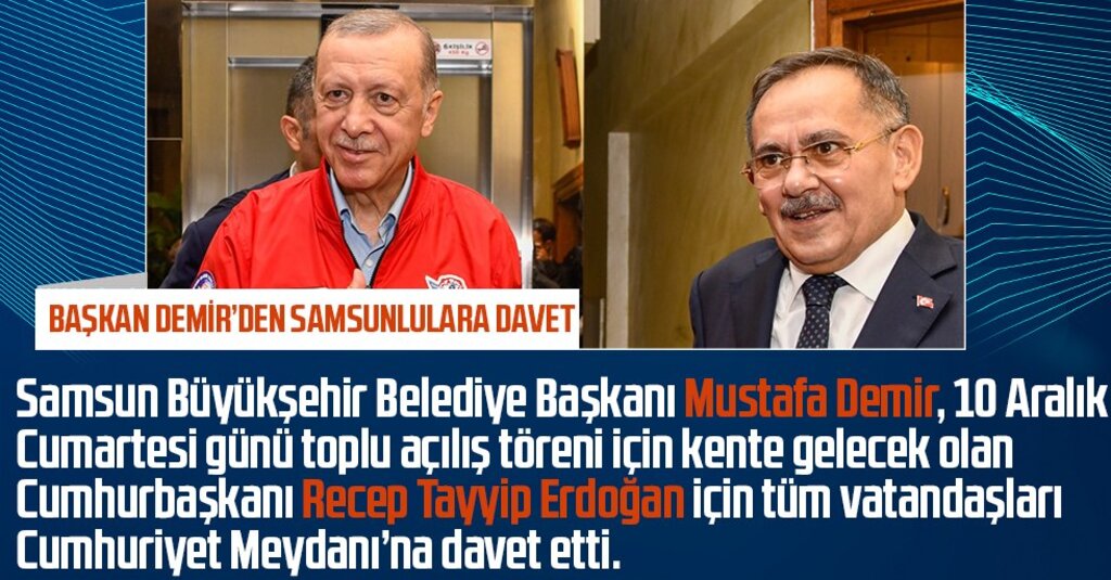 Samsun Büyükşehir Belediye Başkanı Mustafa Demir, 10 Aralık Cumartesi günü kente gelecek olan Cumhurbaşkanı Recep Tayyip Erdoğan için tüm vatandaşları Cumhuriyet Meydanı’na davet etti. Cumhurbaşkanı Erdoğan, 2022 yılındaki ikinci Samsun ziyaretinde hem halkla buluşacak hem de kentte tamamlanan birçok projenin toplu açılışını gerçekleştirecek.