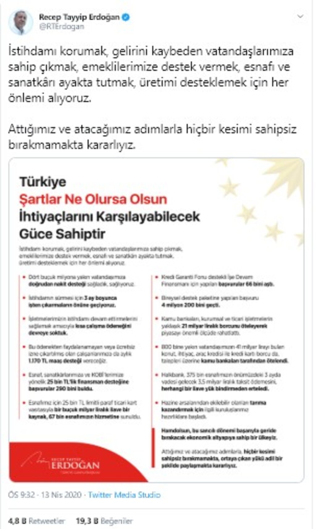"İstihdamı korumak, gelirini kaybeden vatandaşlarımıza sahip çıkmak, emeklilerimize destek vermek, esnafı ve sanatkârı ayakta tutmak, üretimi desteklemek için her türlü önlemi alıyoruz."