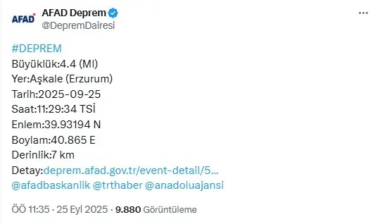 Erzurum’un Aşkale ilçesinde bugün saat 11.29’da 4.4 büyüklüğünde deprem meydana geldi. AFAD’ın verilerine göre, yerin yaklaşık 7 kilometre derinliğinde gerçekleşen sarsıntı, çevre ilçelerden de hissedildi.