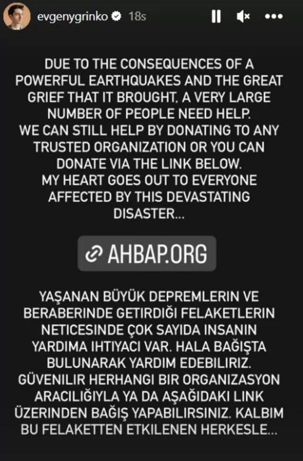 Maddi yardımların doğru kanallara ulaştırılmasının önemine dikkat çeken Evgeny Grinko, Haluk Levent liderliğindeki Ahbap Derneği’nin uluslararası bağış linklerini takipçileriyle paylaştı. "Güvenilir organizasyonlar aracılığıyla bağış yapabilirsiniz" diyen Grinko, bölgedeki insani yardım çalışmalarına katkı sağlanması noktasında köprü görevi gördü.
