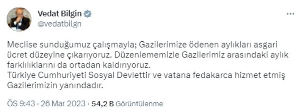 Bakan Vedat Bilgin, sosyal medya hesabı üzerinden yaptığı açıklamada, gazilere ödenen aylıkların artık asgari ücret (8 bin 500 TL) seviyesinden az olmayacağını belirtti. Düzenlemenin en önemli noktalarından biri de farklı statülerdeki gaziler arasındaki maaş farklılıklarının ortadan kaldırılması oldu. Bakan Bilgin, "Meclis'e sunduğumuz çalışmayla; gazilerimize ödenen aylıkları asgari ücret düzeyine çıkarıyoruz. Türkiye Cumhuriyeti sosyal devlettir ve vatana fedakarca hizmet etmiş gazilerimizin yanındadır" ifadelerini kullandı.