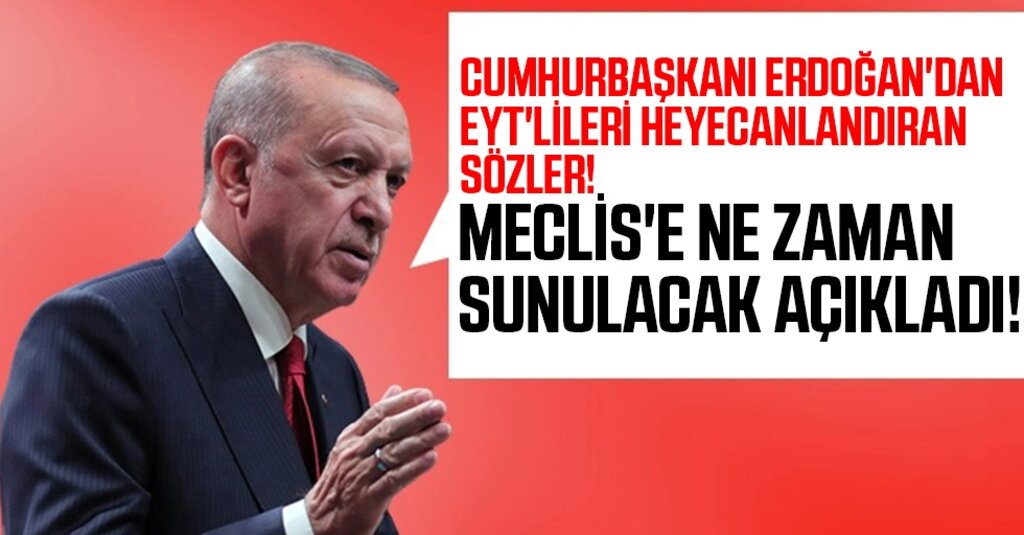 Türkiye'nin uzun süredir gündeminde yer alan Emeklilikte Yaşa Takılanlar (EYT) düzenlemesine ilişkin son dakika gelişmeleri vatandaşlar tarafından yakından takip ediliyor. Cumhurbaşkanı Recep Tayyip Erdoğan, Cumhurbaşkanlığı Kabine toplantısının ardından yaptığı açıklamalarda, milyonlarca kişiyi ilgilendiren EYT çalışmasının tamamlandığını bildirdi. Erdoğan, herhangi bir sınırlamaya gitmeksizin sorunu kökten çözecek olan bu çalışmanın çok yakında Türkiye Büyük Millet Meclisi'nin (TBMM) takdirine sunulacağını ifade etti.