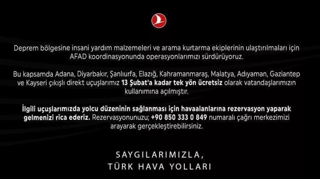 Deprem bölgesinden dönüşler için ücretsiz uçuşlar için Pegasus'un ardından Türk Hava Yolları da açıklamada bulundu. Deprem bölgesinden ayrılmak isteyen vatandaşların ücretsiz uçuşlardan yararlanmak için önceden rezervasyon yaptırmaları gerekiyor. 8 ilden yapılacak uçuşlar için biletlerin ücretsiz olacağı açıklandı.