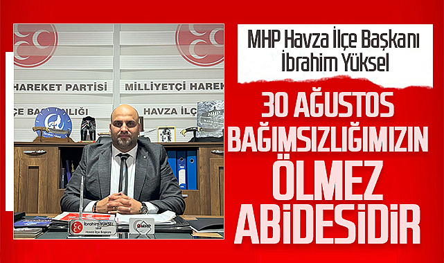 Milliyetçi Hareket Partisi (MHP) Havza İlçe Başkanı İbrahim Yüksel, 30 Ağustos Zafer Bayramı’nın 103. yıl dönümü dolayısıyla bir kutlama mesajı yayımladı. Yüksel, bu şanlı zaferin Türk milletinin bağımsızlık konusundaki azim ve kararlılığını tüm dünyaya ilan ettiğini belirterek, 30 Ağustos’un milli birlik ve beraberliğin en güçlü göstergesi olduğunu vurguladı.