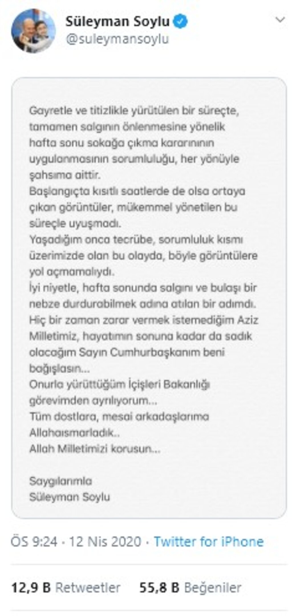 İçişleri Bakanı Süleyman Soylu, hafta sonu uygulanan sokağa çıkma yasağının ilan ediliş biçimi ve sonrasında oluşan görüntülere ilişkin sorumluluğu üstlenerek görevinden istifa ettiğini açıkladı. Sosyal medya hesabı üzerinden kamuoyuna seslenen Soylu, kararının gerekçesini "sürecin yönetimiyle uyuşmayan görüntüler" olarak nitelendirdi.