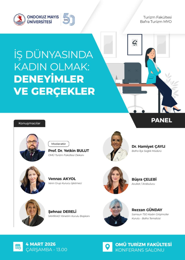 Ondokuz Mayıs Üniversitesi Turizm Fakültesi ve Bafra Turizm MYO iş birliğiyle düzenlenen “İş Dünyasında Kadın Olmak: Deneyimler ve Gerçekler” başlıklı panel, akademisyenler, kamu temsilcileri ve sektör paydaşlarının katılımıyla gerçekleştirildi. Kadının iş dünyasındaki konumu, hukuki güvenceleri ve toplumsal yansımaları farklı perspektiflerden ele alındı.