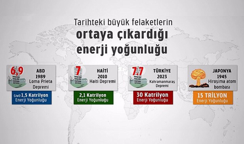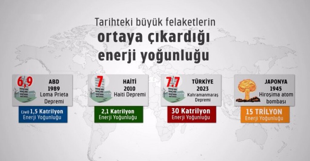 Tarihteki büyük felaketlerin ortaya çıkardığı enerji verileri incelendiğinde, 6 Şubat sarsıntılarının dünya üzerinde benzeri olmayan bir yoğunluğa sahip olduğu görülüyor. Bilimsel veriler, 7.7 büyüklüğündeki ilk depremin bile tek başına küresel ölçekteki birçok felaketi katbekat geride bıraktığını kanıtlıyor.