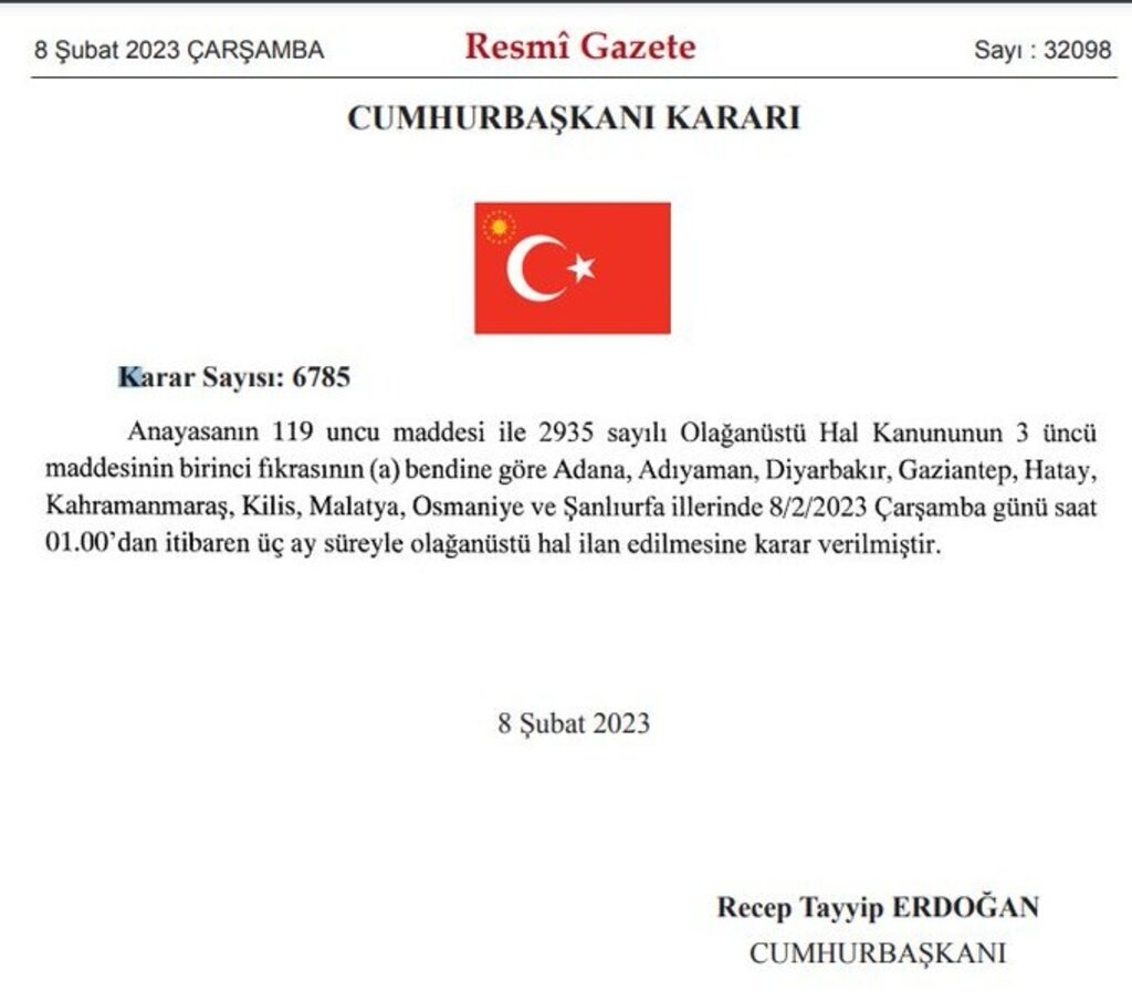 Kahramanmaraş merkezli depremlerden etkilenen 10 ilde 3 ay süreyle Olağanüstü Hal (OHAL) ilan edilmesine ilişkin Cumhurbaşkanı Kararı, Resmi Gazete’de yayımlandı. Karar, bugün saat 01.00 itibarıyla yürürlüğe girdi.