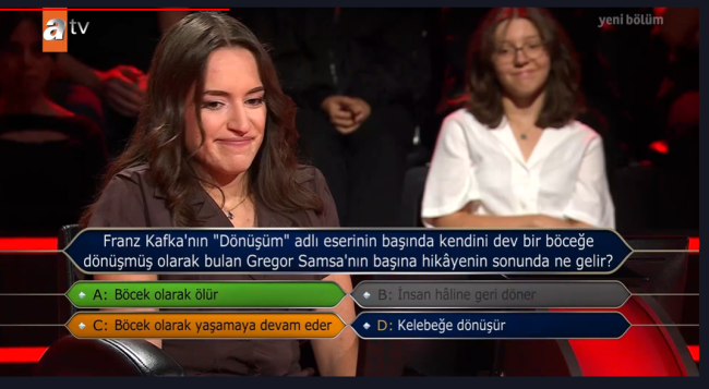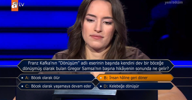 İlk olarak B şıkkı (İnsan hâline geri döner) cevabını veren yarışmacı, emin olamayınca ikinci hakkını C şıkkı (Böcek olarak yaşamaya devam eder) yönünde kullandı.