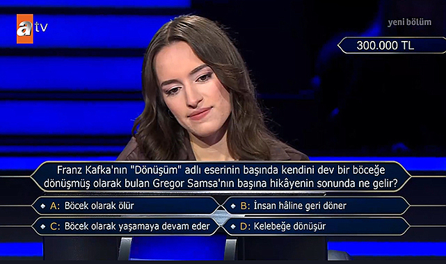 ATV ekranlarında yayınlanan “Kim Milyoner Olmak İster?” yarışmasında bu hafta Franz Kafka’nın “Dönüşüm” adlı eserinden gelen edebiyat sorusu dikkat çekti. 300 bin TL değerindeki soru, hem yarışmacıyı hem de izleyicileri ekran başına kilitledi.
