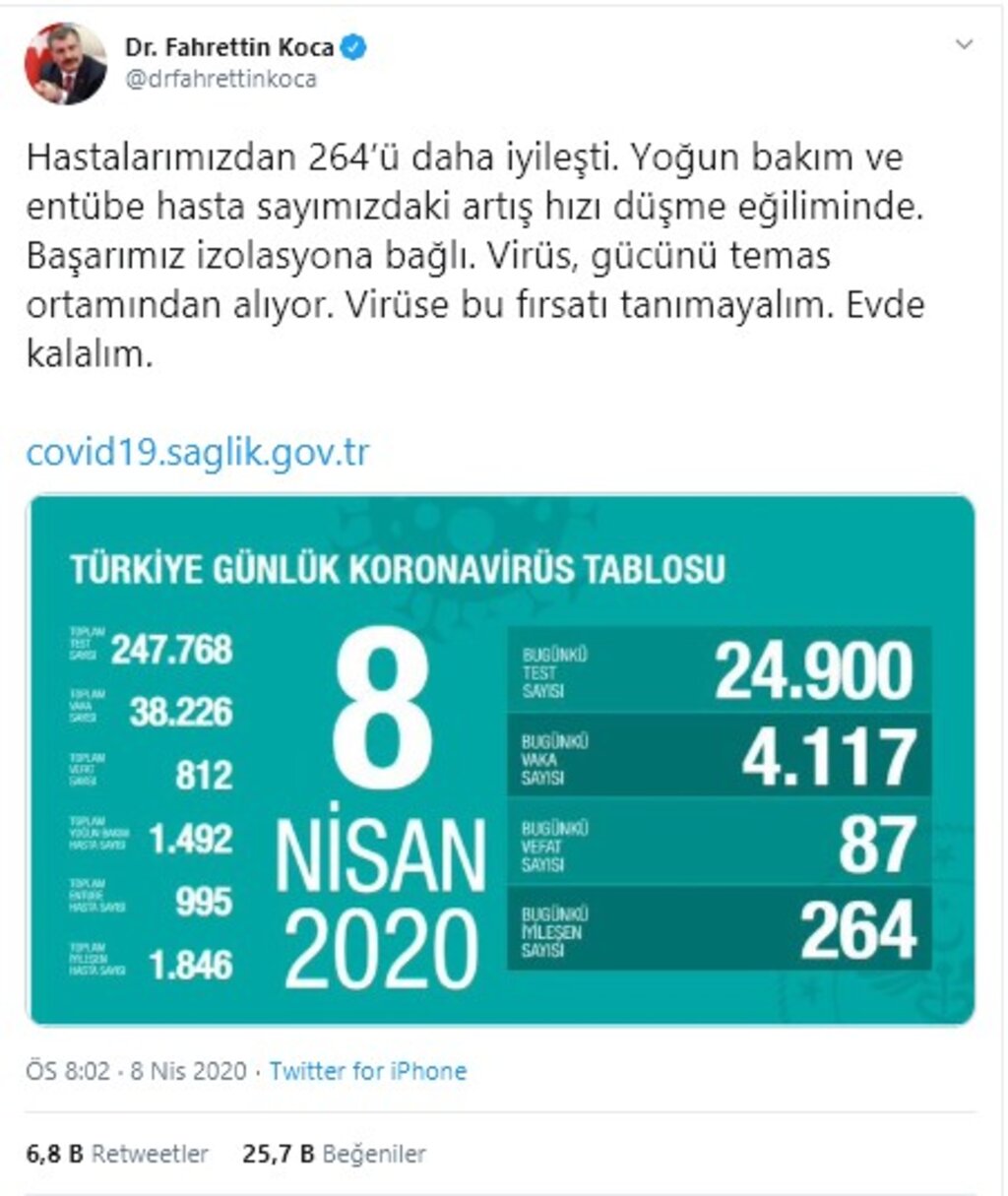 Bakan Koca, sosyal medya üzerinden yaptığı açıklamada, salgının yayılım zincirini kırmanın tek yolunun izolasyon olduğunu hatırlattı. Virüsün gücünü toplumsal temas ortamından aldığını belirten Koca, vatandaşlara şu sözlerle seslendi: "Başarımız izolasyona bağlı. Virüs, gücünü temas ortamından alıyor. Virüse bu fırsatı tanımayalım. Evde kalalım."