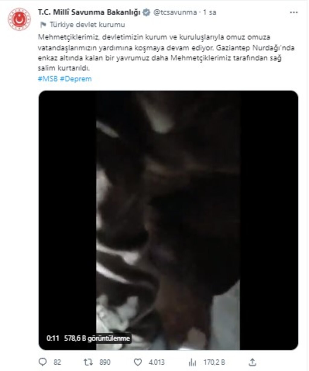 Gaziantep'te enkaz altında kalan minik bir kız çocuğu, Mehmetçik tarafından kurtarıldı. Minik kızın askerler tarafından kurtarılırken 'Annemi de kurtarın' sözleri yürekleri yaktı.