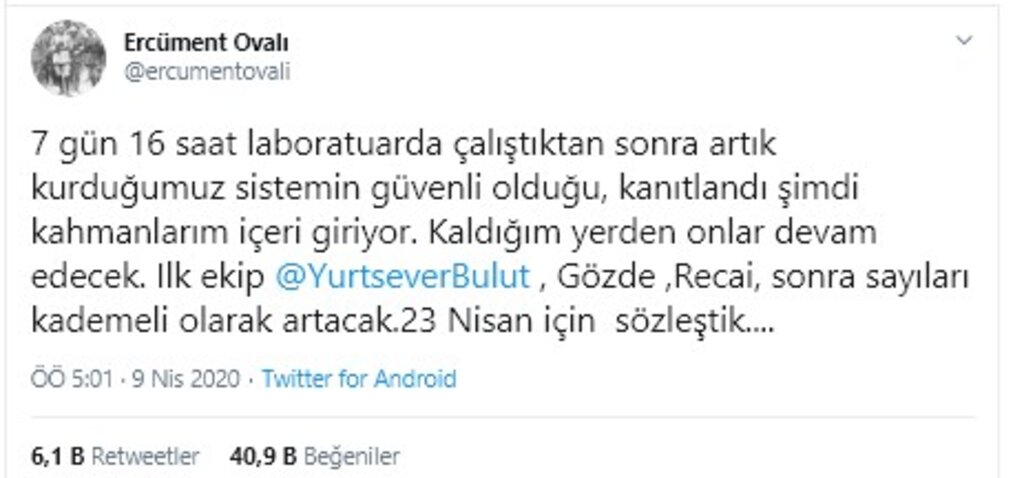 Sosyal medya üzerinden açıklamada bulunan Ovalı, “7 gün 16 saat laboratuvarda çalıştıktan sonra artık kurduğumuz sistemin güvenli olduğu kanıtlandı. Şimdi kahramanlarım içeri giriyor. Kaldığım yerden onlar devam edecek. İlk ekip @YurtseverBulut, Gözde, Recai, sonra sayıları kademeli olarak artacak. 23 Nisan için sözleştik…” ifadelerini kullandı.