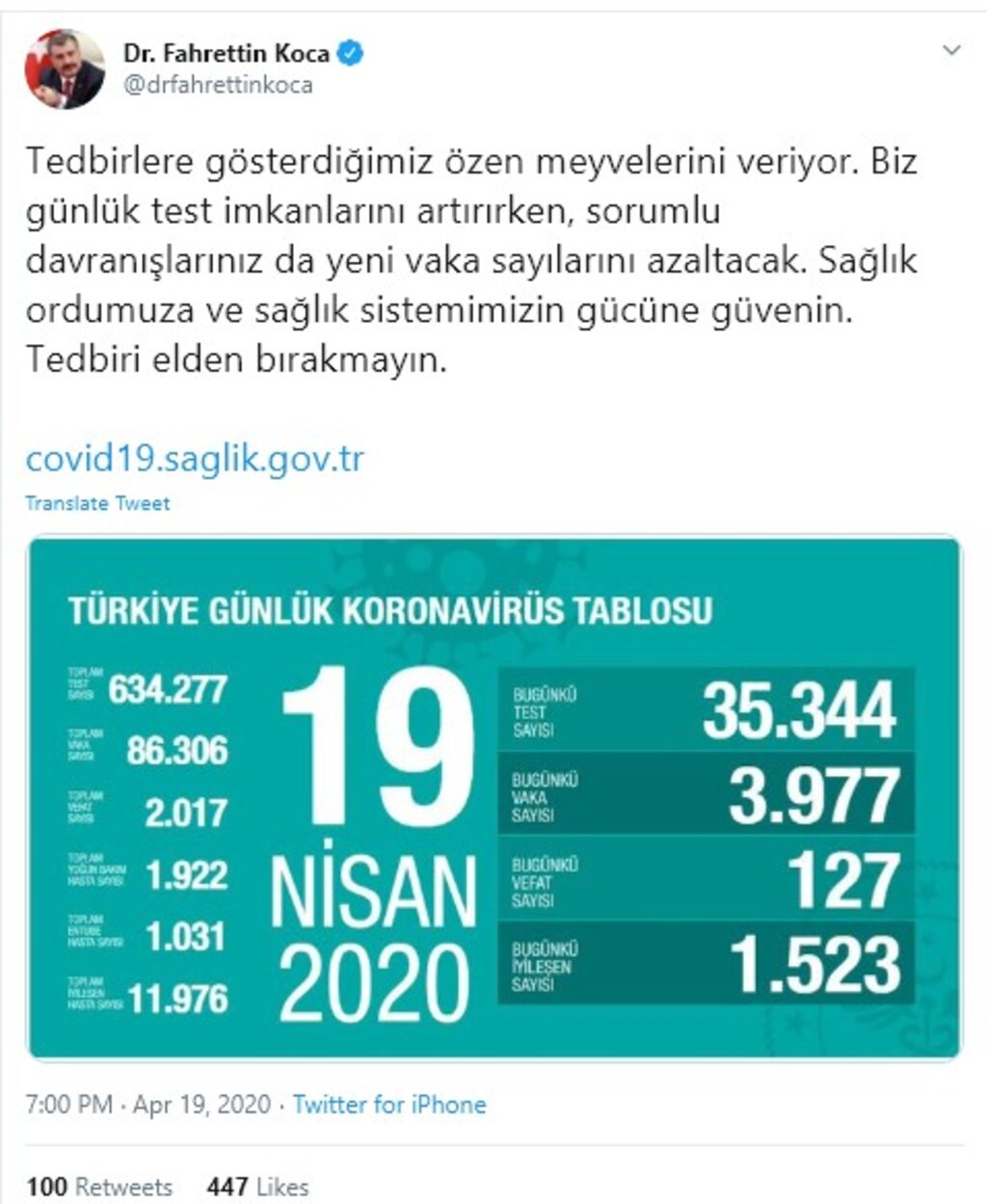 "Tedbirlere gösterdiğimiz özen meyvelerini veriyor. Biz günlük test imkanlarını artırırken, sorumlu davranışlarınız da yeni vaka sayılarını azaltacak. Sağlık ordumuza ve sağlık sistemimizin gücüne güvenin. Tedbiri elden bırakmayın."