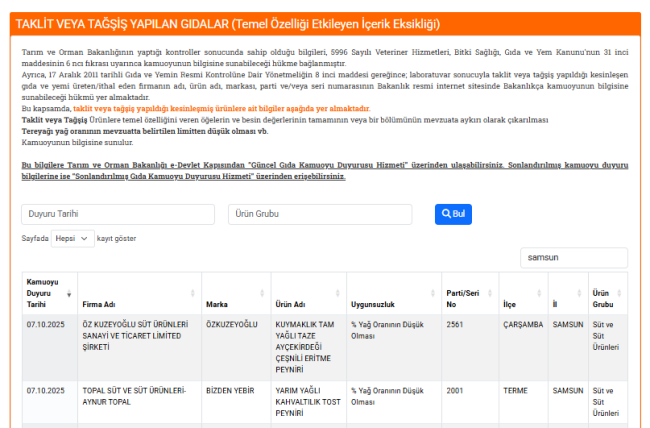Tarım ve Orman Bakanlığı, Türkiye genelinde yürütülen resmi gıda kontrolleri sonucunda taklit veya tağşiş yapıldığı belirlenen ürünleri kamuoyu ile paylaştı. 7 Ekim 2025 tarihinde yayımlanan duyuruda, Samsun’da üretim yapan iki peynir markasında mevzuata aykırı durumlar tespit edildi.Bakanlığın laboratuvar analizlerine göre, her iki firmaya ait peynirlerde yağ oranının mevzuatta belirtilen limitin altında olduğu saptandı. Bu durum, ürünlerin temel özelliklerini etkileyen bir unsur olarak değerlendirilerek taklit ve tağşiş kapsamında değerlendirildi.Uygunsuzluk tespit edilen firmalar ve ürünleri şöyle açıklandı:
