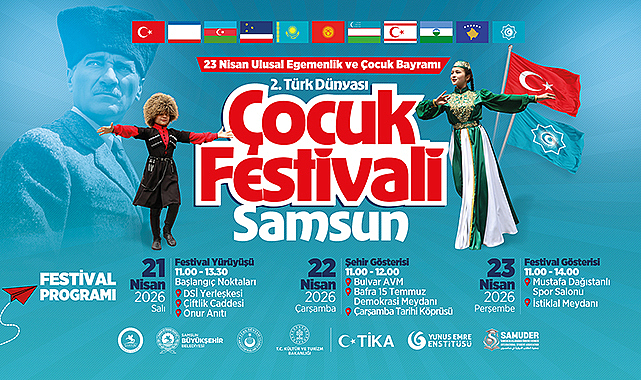 Samsun’umuz, çocuklarımızın neşeyle gülümsediği, dostluk ve kardeşlik bağlarının güçlendiği büyük bir festivale ev sahipliği yapıyor. Türk Dünyası’nın farklı coğrafyalarından gelen evlatlarımızı buluşturan bu özel organizasyon, kültürel birlikteliğimizi pekiştirirken 23 Nisan ruhuna yaraşır bir kutlama sunacak. Sevginin ve dayanışmanın en güzel örneklerine sahne olacak bu buluşmaya tüm ailelerimizi bekliyoruz.