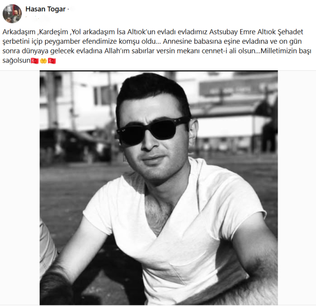 “Arkadaşım, kardeşim, yol arkadaşım İsa Altıok’un evladı, evladımız Astsubay Emre Altıok şehadet şerbetini içip peygamber efendimize komşu oldu… Annesine, babasına, eşine, evladına ve on gün sonra dünyaya gelecek bebeğine Allah sabır versin. Mekânı cennet-i âlâ olsun. Milletimizin başı sağ olsun.”