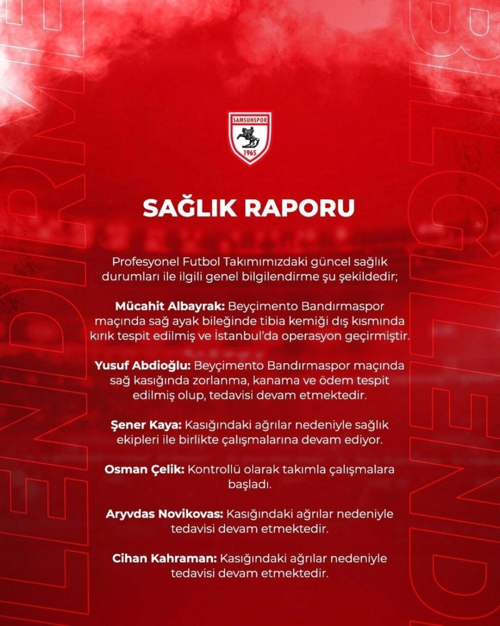 Mücahit Albayrak: Bandırmaspor maçında sağ ayak bileğinde tibia kemiği dış kısmında kırık tespit edildi. İstanbul’da operasyon geçirdi.