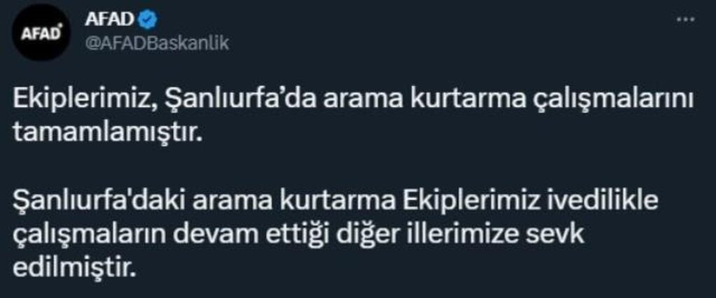 Bu gelişmeden bir süre sonra AFAD, Kilis'te de arama kurtarma çalışmalarının tamamlandığını, ekiplerin diğer illere yönlendirildiğini duyurdu.