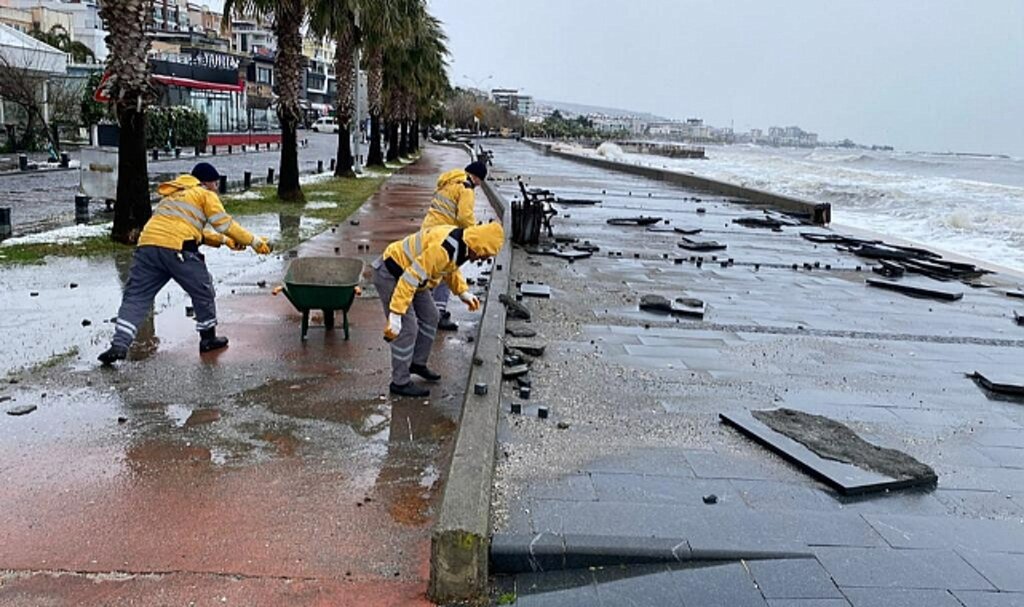 Park Bahçeler ve Çevre Koruma Kontrol Dairesi Başkanlığı ekipleri, iş makineleri desteğiyle sahil şeridinde kapsamlı temizlik çalışması başlattı. Kaya parçaları kaldırılırken, zarar gören alanlarda onarım çalışmaları da eş zamanlı olarak yürütüldü.