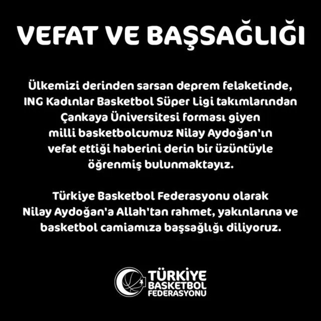 Türkiye Basketbol Federasyonu, deprem sonrasında enkaz altında kalan ve bir süredir aranan milli basketbolcu Nilay Aydoğan'ın yaşamını yitirdiğini açıkladı."ING Kadınlar Basketbol Süper Ligi takımlarından Çankaya Üniversitesi'nin milli oyuncusu Nilay Aydoğan'ın deprem felaketinde hayatını kaybettiğini derin bir üzüntüyle öğrenmiş bulunuyoruz. Merhumeye Allah'tan rahmet ailesine, yakınlarına ve basketbol camiasına başsağlığı dileriz."Deprem anında Malatya'da olduğu öğrenilen Aydoğan için spor kulüplerinden taziye mesajları yayımlandı.