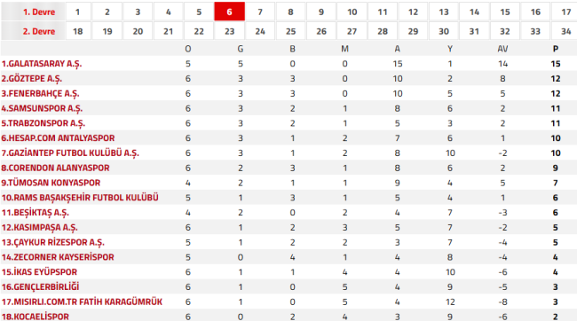 Galatasaray, haftayı maç yapmadan lider olarak kapattı ve 5’te 5’lik galibiyet serisiyle 15 puana ulaştı. Göztepe ve Fenerbahçe 12 puanla ikinci ve üçüncü sırada yer alırken, Samsunspor ve Trabzonspor 11’er puanla takipte. Ligin alt sıralarında ise Kocaelispor 2 puanla son sırada bulunuyor.