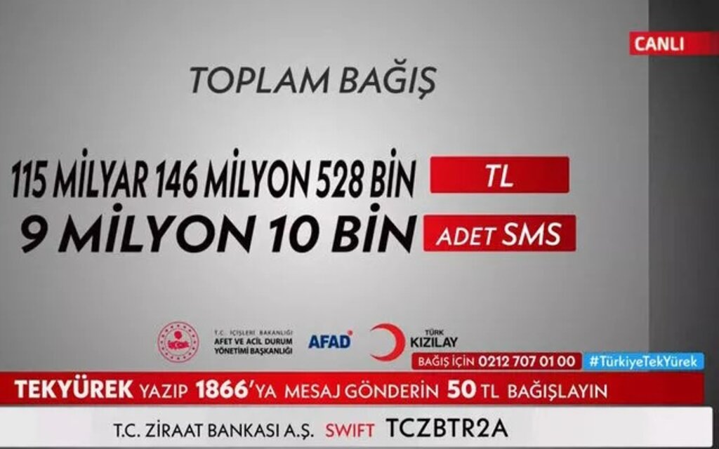 Canlı yayın sonunda açıklanan verilere göre, kampanya boyunca toplam 115 milyar 146 milyon 528 bin TL nakdi bağış toplandı. Kısa mesaj yoluyla destek vermek isteyen vatandaşlar ise toplamda 9 milyon 10 bin adet SMS göndererek kampanyaya katılım sağladı. Toplanan meblağ, AFAD ve Kızılay koordinesinde deprem bölgesindeki ihtiyaçlar için kullanılacak.