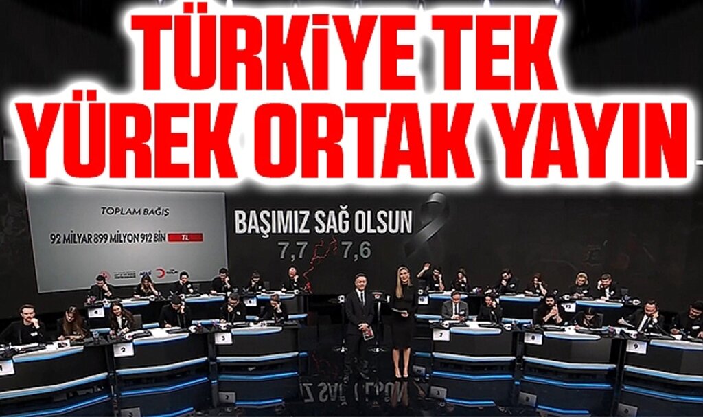 Başta Kahramanmaraş ve Hatay olmak üzere Adıyaman, Gaziantep, Adana, Osmaniye, Malatya, Diyarbakır, Şanlıurfa, Kilis’i etkileyen depremlerin yıkıcı sonuçlarını yaşayan vatandaşlarımız için Türkiye’nin tek yürek olacağı canlı yayın tüm kanallarda aynı anda ekranlara geliyor.Ülkeyi yasa boğan deprem felaketinde yaraları sarmak için 15 Şubat Çarşamba akşamı saat 20.00’de başlayan yardım programının moderatörlüklerini Nihat Hatipoğlu, Pelin Çift, Çağla Şıkel, Tümer Doğru, Nazlı Çelik, Acun Ilıcalı, Deniz Bayramoğlu, Didem Arslan Yılmaz üstleniyor. Ortak yayında sanat, iş ve spor dünyasının önde gelen isimleri ve halk depremzedelere destek oluyor.